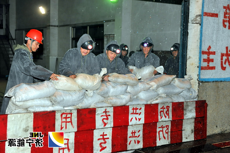22∶48,副井口抢险小组赶到副井口,使用沙袋在副井井口房东侧防火门下方筑墙堵水。运输工区安排专人人工喷水仿造降雨,抢险人员身穿雨衣进行抢险堵墙。